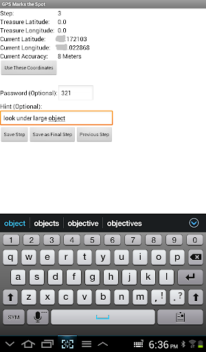 The full version provides for the automated capturing of GPS coordinates, hints for each step, and an optional password which requires entry in order to continue on to the next step. When creating the hunt you can automatically save your current coordinates as the step destination, enter an optional hint, and also an optional password for each step. When you’re done with creating each step, the treasure seeker can use the map to get to the step’s destination, using the optional hint (like "look up in the tree branches"). This seeker can find a physical note there at the step destination which could include the password which when entered into the app allows them to move on to the next treasure hunt step.
