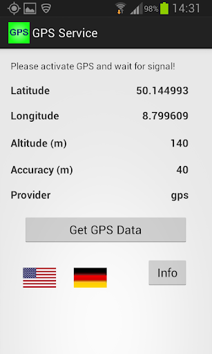 Eine einfache App zur Bestimmung der aktuellen GPS-Position. Es werden ferner die Höhe über N.N. und die Genauigkeit angezeigt.