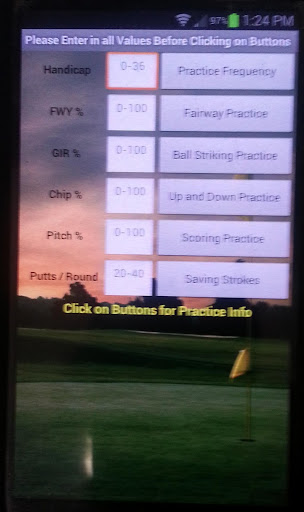 This app is simple, enter in your personal golf statistics from your last few rounds, click on 'Practice Frequency' to see how often to practice each regimen. Then click on the facet you want to practice on. Below will pop-up your regimen. Repeat with all the practice regimens. The time needed for beginners is about 1 hour total per week and for scratch and better is over 10 hours per week. If you are able to work on your game for at least 6 weeks using this system, we guarantee your handicap will improve.