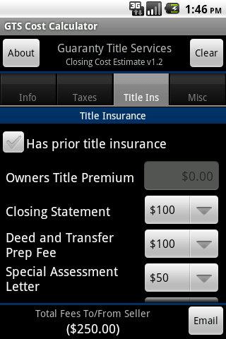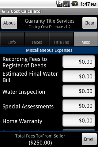 This application is designed to help provide a rough estimate of closing costs that you will incur when doing a closing or title insurance with Guaranty Title Services, Inc. It calculates the estimated amount of taxes you will owe as well as fees that will be paid to agents.