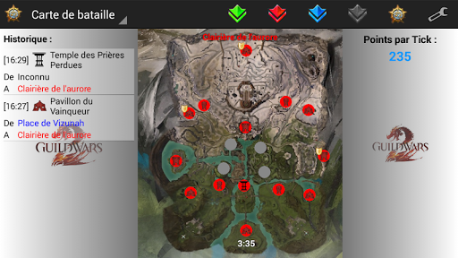 All objectives are represented on the dynamic map, with the color of the current world owning it. By a simple touch on an objective, you can get details about it like the name of the guild which claimed it.