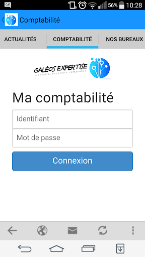 Notre application vous permettra de vous connecter à votre comptabilité en ligne, à l'actualité juridique fiscale et sociale et de nous géolocaliser.
