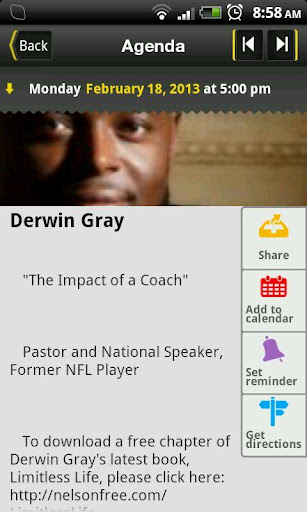 • Take Speaker Notes—and experience the effective, enriching way to follow along with the speaker. As you are inspired throughout the day, you will find it much easier to simply save your thoughts and ideas in the app, all categorized differently for each speaker. For added convenience and clarity, you can also print or convert your notes into e-mail!