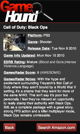 GameHound is an application that was created to search for information on your favorite video games and finding those games is as easy as tapping a button. Simply choose your preferred game platform and genre, and then list the games. Optionally, you can list games by their titles or search for a very specific game by name.
