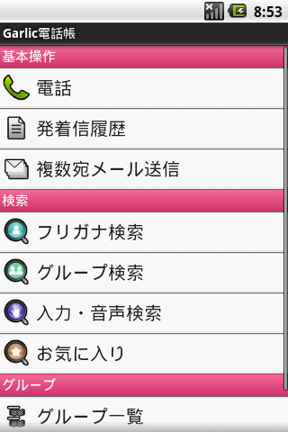 "GarlicContacts" is a simple telephone book application equipped with a smooth retrieval function and the group edit function.