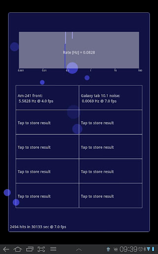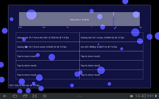The usual background radiation is very low and it can take minutes until the first event is registered. Blue circles indicate when and where radiation has been detected.