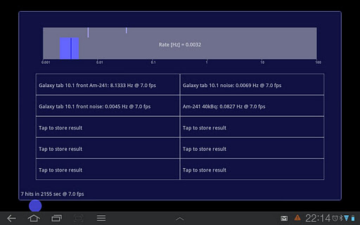 On a Samsung Galaxy tab the natural background was measured at 0.006 Hz whereas on an Xperia X8 it was 0.0007. In a laboratory test with a well known americium (Am-241) source, both registered a much higher rate 8.1Hz and 0.79 Hz respectively. An airport security scanner registered at 0.23 and 0.026 Hz, respectively. So while all phones are different, they register an increase in radiation consistently.
