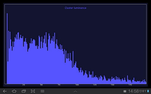 The blue line shows the estimated radiation and the blue area indicates the precision of the measurement. Longer measurements e.g. over night with the power supply plugged in will yield very precise results. The white lines show the rate in the last 30 seconds and five minutes.