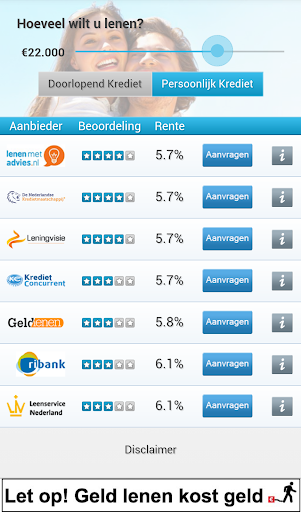 In deze Geld Lenen app kunt u vanaf 2500 euro offertes aanvragen. De meest populaire bedragen zijn 5000, 10000, 15000 en 20000 euro. Via deze Geld Lenen app kunt u leningen vergelijken tot ongeveer 30000 euro.