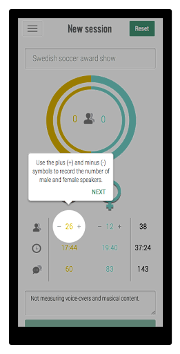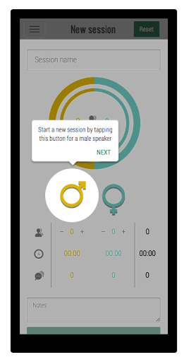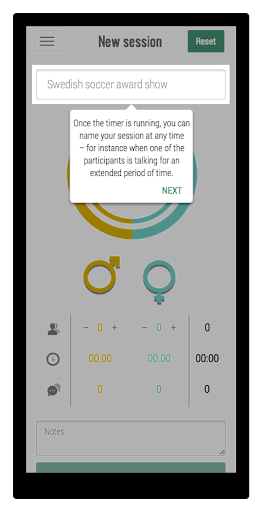 GenderTimer promotes gender awareness in social groups and workplaces. Gender Timer shows you clearly who is talking the most, men or women and helps you see and discuss normative gender patterns. Just seeing the numbers helps people self-regulate, and improve. How much air-time do women and men take in your meetings and conversations? Use GenderTimer to find out!