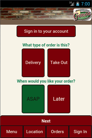 This is the android application for Genoa Pizza and Bar located in Pittsburgh, PA. Use this site to place orders directly to our store. For more information, or to view our full online site, please visit us at www.genoapizza.net