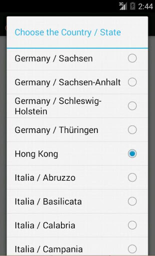 The application starts in Hong Kong. You can choose your country or state through the application settings. Write me by email if you can't find your country or state, I will add it in the next version.