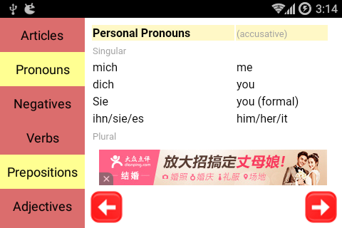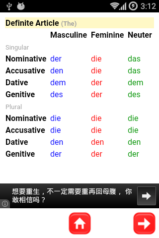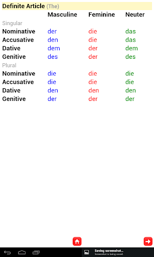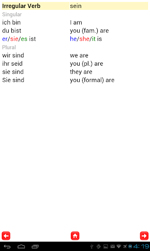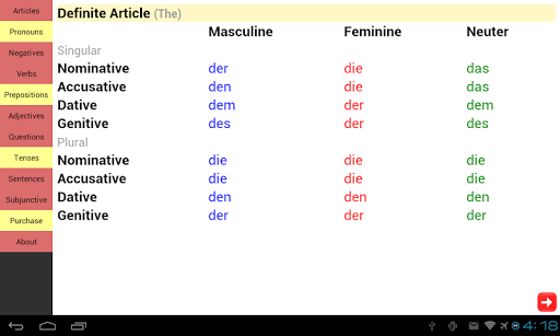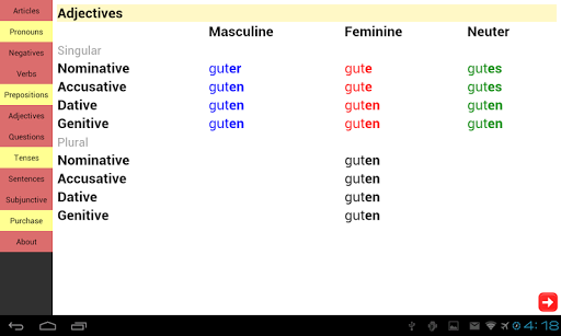 German grammar charts. Useful as a quick reference for people who already know some German. If you want to support the app, please consider purchasing the paid version which does not contain ads, and please feel free to email your suggestions, comments and any problems you find. Thanks :)