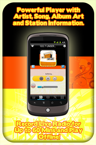Germany radio with live recording comes loaded with numerous Germany radio stations playing best Germany music from all around the world. Easy to use application comes with amazing live radio recording feature which could later be played offline in a fully functional media player.