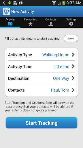 Use the Favorites feature to save the details of things you do often for a quick start, just a few clicks and in under five seconds you have told someone you trust what you are doing!! Perfect for things you do often like walking home from school, running or driving.