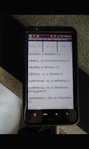 The Getting Greek: Every NT Word App contains all 5,393 Koine Greek words found in the Greek New Testament. You can use the app like flashcards, like a lexicon or as a word-frequency checker. It contains an incredibly user-friendly interface, which consists of 3 tabs listing word frequencies: 20kx-5x, 4x-2x and 1x. This app will be useful for clergy, laypersons, professors, students, seminarians and ancient language-lovers alike. Get it now, for only .99 cents!!!