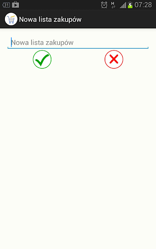 * You will get a new view where you can enter a name for the new shopping list. Button with a green check mark approves, button with a red 'x' symbol - cancels.