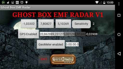 "I used your Ghost EMF Radar together with the Talking Spirit Radio on November 15th, 2014, when I visited Bran Castle here in Romania. As recommended, I placed the smartphone Samsung Galaxy GT-I9300 on a desk inside the castle, started the Spirit Radio together with the EMF Radar. It took a while when there was a peak on gravity alerted by the smartphone. Some seconds later your Spirit Radio said: "Missy with Carol" which was awesome. Marie was princess of that county and living in Bran castle together with his son Carol / Karl, she was called "Missy".