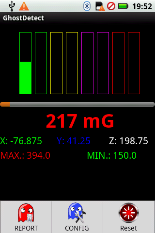 This application was programmed to NEVER hibernate with this advantage you can put the device to measure the night away at a certain place, and just check the maximum value in the next day. In the version 1.2 add Ghost-report, with this resource you can discover the time happen Paranormal Activity.