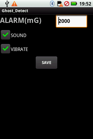 It also has alarm that can be SOUND or VIBRATION, triggered when measuring ultra passed 1000mG (In the version 1.2, you can choose the alarm value with your experience). I developed it for the purpose of leaving the most sensitive possible.