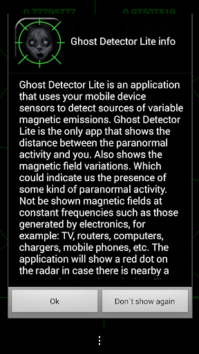 Ghost Detector Lite is an application that uses your mobile device sensors to detect sources of variable magnetic emissions. Ghost Detector Lite is the only app that shows the distance between the paranormal activity and you. Also shows the magnetic field variations. Which could indicate us the presence of some kind of paranormal activity.