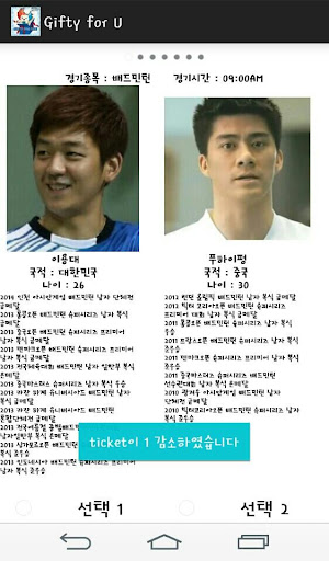 ticket은 공유시 2개 댓글작성시 1개를 얻을 수 있으며 경기일정 하단의 파란 버튼을 클릭시 ticket 1개를 소모하며 게임화면으로 전환됩니다.