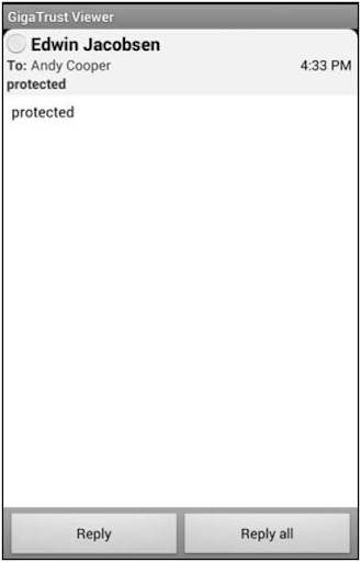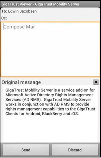 Additionally, Android users can apply AD RMS protection to outgoing email responses and messages. If email permissions allow forwarding, attachments remain protected whether they are accessed on the desktop or on another mobile device. GigaTrust is the only Microsoft partner to bring this level of secure interoperability between AD RMS and your mobile infrastructure.