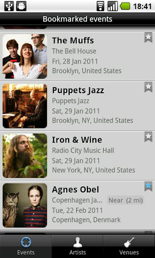 + Bookmark events, venues, or artist to quickly find events