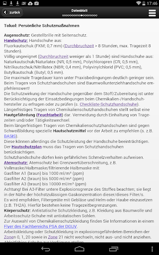 GisChem enthält Datenblätter mit zahlreichen Informationen zum sicheren Umgang mit Gefahrstoffen am Arbeitsplatz. Neben den Gefährdungen werden Schutzmaßnahmen (z.B. Technische und Organisatorische Maßnahmen, Persönliche Schutzmaßnahmen, Brand- und Explosionsschutz) beschrieben und Hinweise z. B. zu den Themen Lagerung und Entsorgung gegeben. Zu jedem Gefahrstoff gibt es auch einen Betriebsanweisungsentwurf zur Information der Beschäftigten.