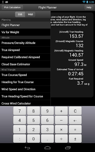 Glenview Software's E6B includes an all-in-one planning calculator panel which allows you to quickly on one screen plan a leg of a course, calculating the magnetic heading and course, as well as the true heading, ETA, fuel burn and ground speed without switching between panels.