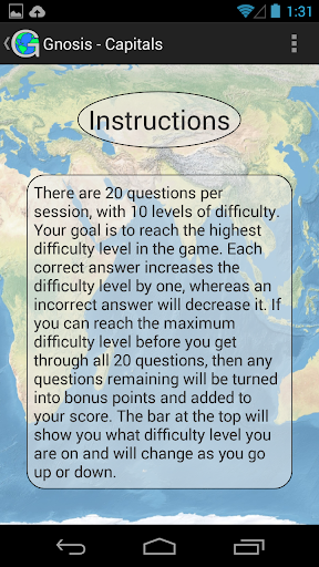 Test yourself with this challenging free capitals quiz game! With persistent scorekeeping and different difficulty levels, Gnosis: Capitals Quiz is a fun way to bolster your geographical knowledge of the countries in the world. This quiz covers the capital cities of 198 countries and is a great way to learn about the capitals of the world.
