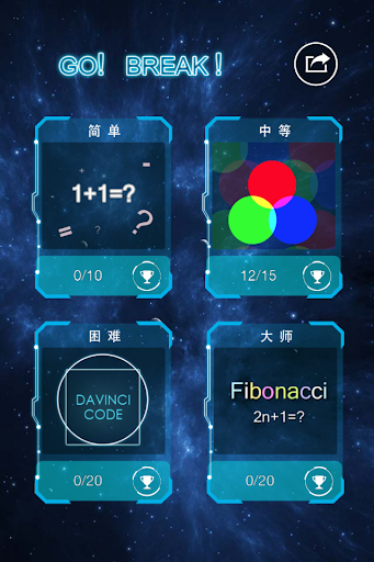 Go Break分為4個難度:簡單,中等,困難,大師級,難度將越來越高,誰能達到最後一關?