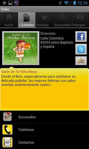 Negocios, Servicios y Profesionales de todos los rubros con las referencias de sus contactos, teléfonos, Web y redes sociales para contactarte con ellos inmediatamente desde tu dispositivo Android, ó que los puedas encontrar en UN MAPA DE LA CIUDAD, ubicando su dirección principal ó de sus sucursales. También puedes ver una foto del lugar para elegir el de tu preferencia.
