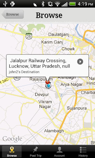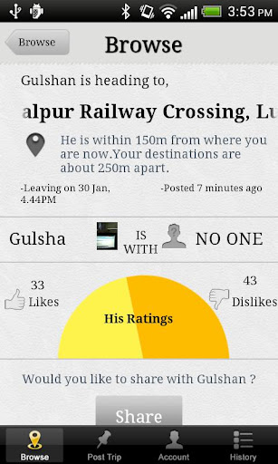 Users can simply browse a list of other users looking to catch a taxi. To share a taxi, all you need to do is input your DESTINATION POINT, and the app will quickly generate a list of users within 200m of your current location. This list will automatically rank users according to destination, meaning users who are going to the closest destination point to YOUR intended destination, will show up first and so forth. This allows for maximum savings and minimal travel times.