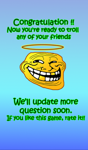 You wanna troll your friends. You wanna be an amazing troll guys. You're shy and don't know how to talk to people. "God of Troll" is exactly what you're looking for !! This game will make you become an interesting guy with good sense of humor.