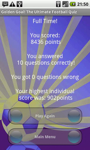 Golden Goal is a multiple time based quiz which will test your general knowledge of all things football!