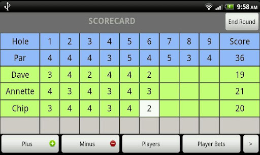 - Auto-populates par for each hole and allows you to simply add or subtract from par
