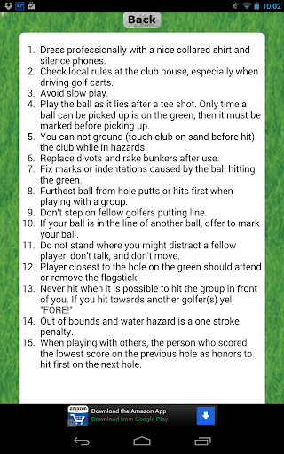 Have you ever been to a golf match or watched golf on TV and didn't know any of the rules or how to play the game? Download Golf For Idjits and it will teach you everything you need to know. This app is designed to teach the not so golf savy person a few rules and etiquette's about the game of golf.