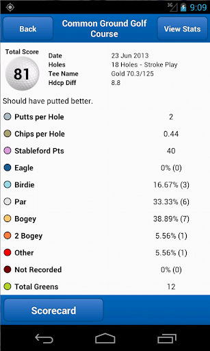 - Quickly and easily view an electronic scorecard of every round of golf you have played using the application, including a summary, statistics and comments for that round.
