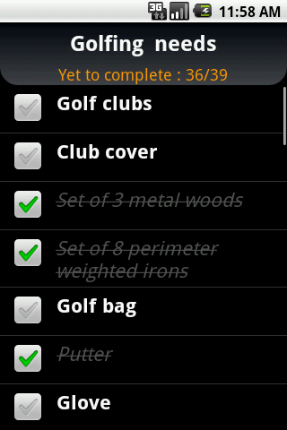 Configurable golf checklist or planner with everything needed for any golfing trip. Comes pre-populated with more than 175 items. Check/uncheck and reuse everytime you organize golf trips. Save all the time typing the list. Easy and very intuitive thumb friendly check/uncheck options.