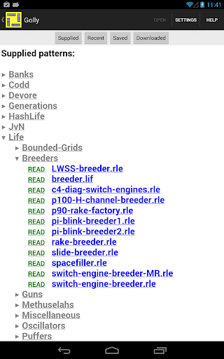 Reads RLE, macrocell, Life 1.05/1.06, dblife, and MCell files.