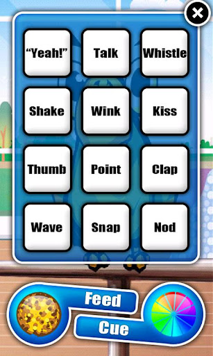 When your session begins Delbert will start offering behaviors he knows how to do. When Delbert presents a vocal behavior you want to train, reinforce him with a food treat. Simply place your finger on the treat and slide it into his beak. Just like in real life, if you quickly and consistently reinforce the behavior you want, the parrot will offer it more frequently. When this happens pick a cue and try to insert it just before you think the behavior will be offered. You will notice a variety of cues to choose from. The cue gains meaning when inserted just before the behavior is presented and then reinforced. If you have played correctly Delbert will present the behavior you have chosen on cue. To practice your training skills, delete the session and retrain the behavior using a different cue.