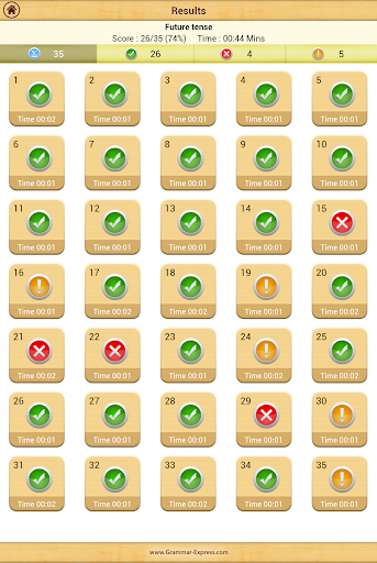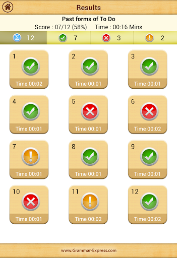 A summary of the practice test is presented at the end of each test. It shows you the time you took, the score, which questions you answered correctly and where you were wrong.