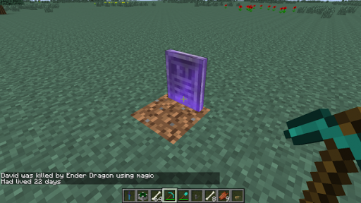 There are 3 possible gravestones for you or villagers to have. Each will have an epitaph written on them and if you have a sword in your inventory you have a chance of having it appear as your grave. You will also find random graves and memorials throughout the game of various mobs and animals who died at some point. Each one has an epitaph written on them as well.