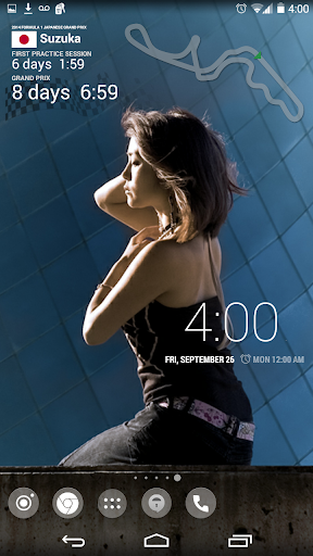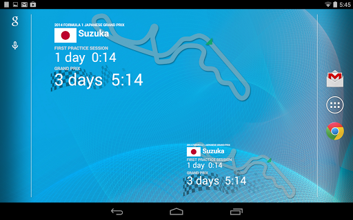 Never miss another F1 race, qualifying, or practice session with this gorgeous countdown clock widget. Pretty up your home screen with a changing calendar of circuit layouts. Resize to fill larger areas.
