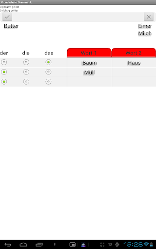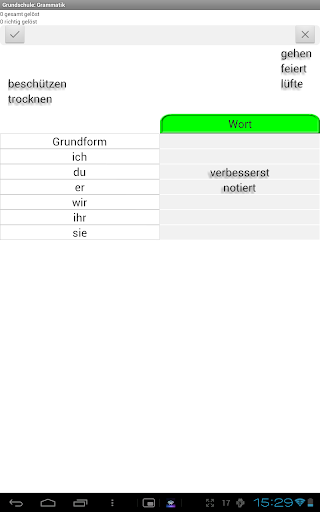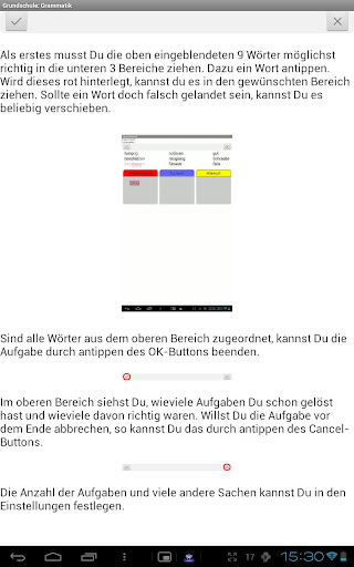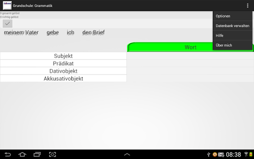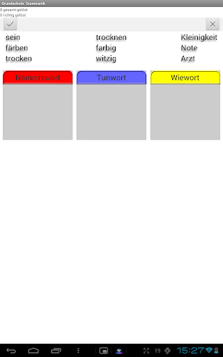 Ziel der App ist es, die Grundlagen der deutschen Grammatik spielerisch zu üben.Die App richtet sich nach den Lehrplänen der 2. bis 4. Klasse. Es werden jeweils einige Worte angezeigt, die in die richtigen Kategorien zugeordnet werden sollen.