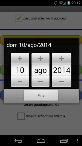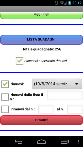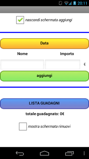 Quest'app permette di inserire i vari importi guadagnati per qualsiasi attività in modo semplice e intuitivo. Ogni guadagno può essere inserito con la data a cui si riferisce, il nome (identificativo) e l'importo. Tutti gli incassi o guadagni vengono ordinati dal più recente al più lontano in una lista facilmente consultabile. Sotto la lista appare il guadagno totale, somma di tutti gli importi inseriti. Per cancellare un guadagno si può fare in diversi modi, o cliccando su di esso nella lista e scegliendo elimina, oppure usando la schermata apposita sotto la lista. In quest'ultimo caso si può cancellare anche un intervallo di guadagni fornendo i numeri di inizio-fine. I numeri sono la posizione che occupa il guadagno nella lista e si possono sapere cliccando sul guadagno nella lista.