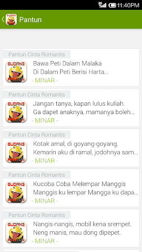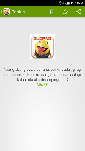 Gudang Pantun adalah sebuah aplikasi android simple dan sederhana yang berisikan kumpulan pantun terbaru, terbaik dan lucu yang telah kami rangkum untuk anda.