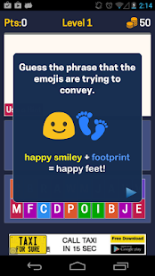 Every puzzle shows you a set of the well known emoji icons. Choose from a set of letters to guess the correct phrase which could be anything from common phrases to the latest hit songs. Some answers are easy and obvious while others require you to think laterally. Earn coins as you complete every puzzle with bonus on level completion.