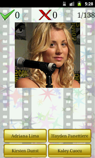 This is very cool game for guessing celebrities. One by one they will appear on screen and you have to pick the right name for everybody. Collect stars to unlock second category which is harder to guess. Every 50 points give you 1 star. That means that in first category you can make 2 stars and you must make extra one for guessing 130 people to get 3 stars. This allows you to play second category. Guess 100 celebs in second category and you will achieve all stars. Enjoy!